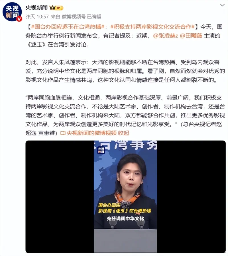 而眼下,《逐玉》也已经火到了台湾省,国台办还专门在新闻发布会上夸奖这部剧,表示要“两岸同胞血脉相连、文化相通,两岸影视合作基础深厚、前景广阔,我们要“积极支持两岸影视文化交流合作”,短短14个字,却听的人动容不已。