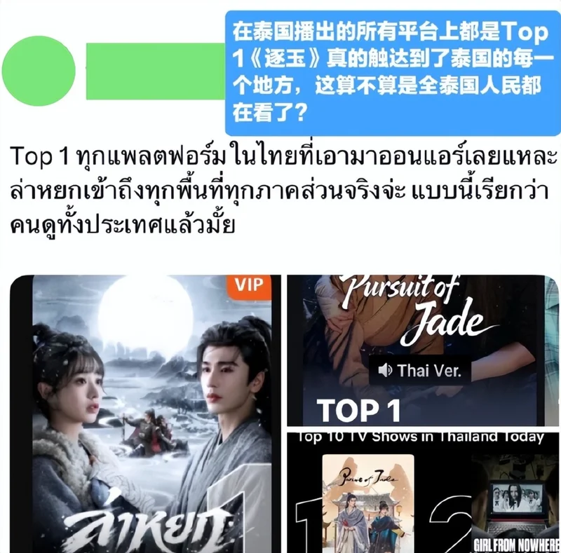 有一位泰国的网友评价,“在泰国播出的所有平台上都是Top1,《逐玉》真的触达到了泰国的每一个地方,这算不算是全泰国人民都在看了?”