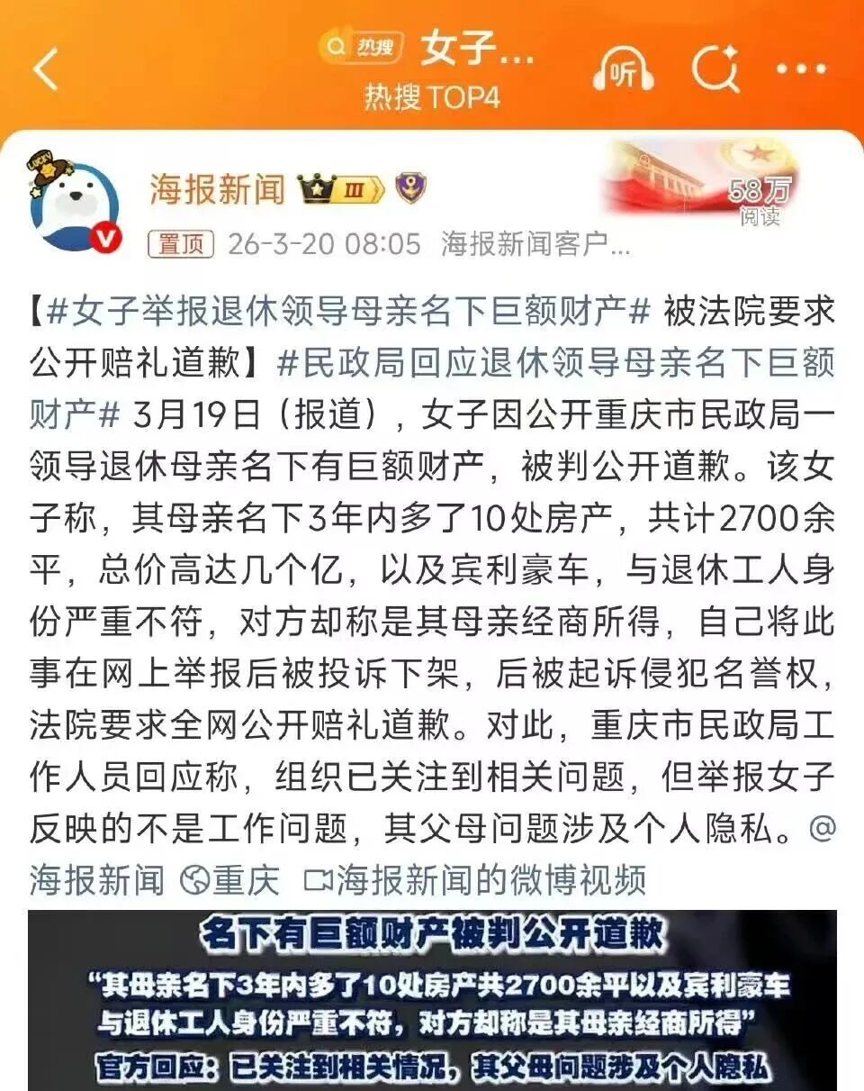 大体的意思就是,一个女子因为公开了重庆民政局领导母亲的巨额财产,然后被判处公开道歉,而官方给的理由是,举报女子反映的不是工作问题,领导父母的问题涉及个人隐私!