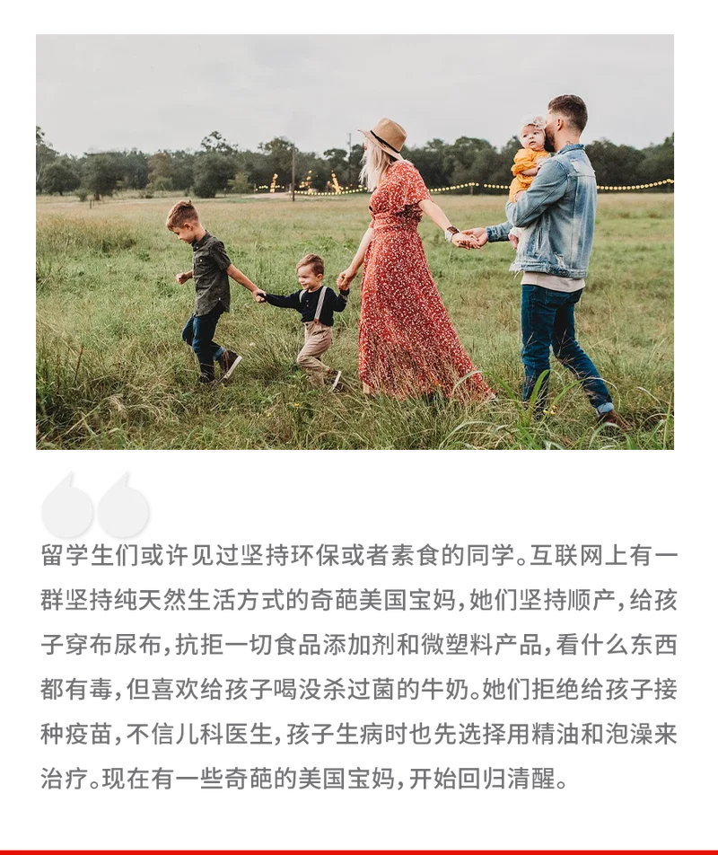 她们倡导原始天然的生活方式,坚持在家顺产生娃,经常光着脚带孩子去公园玩,喝没杀过菌的牛奶,认为超市里卖的洗手液洗衣液都是“有毒”的,不让孩子接种疫苗。