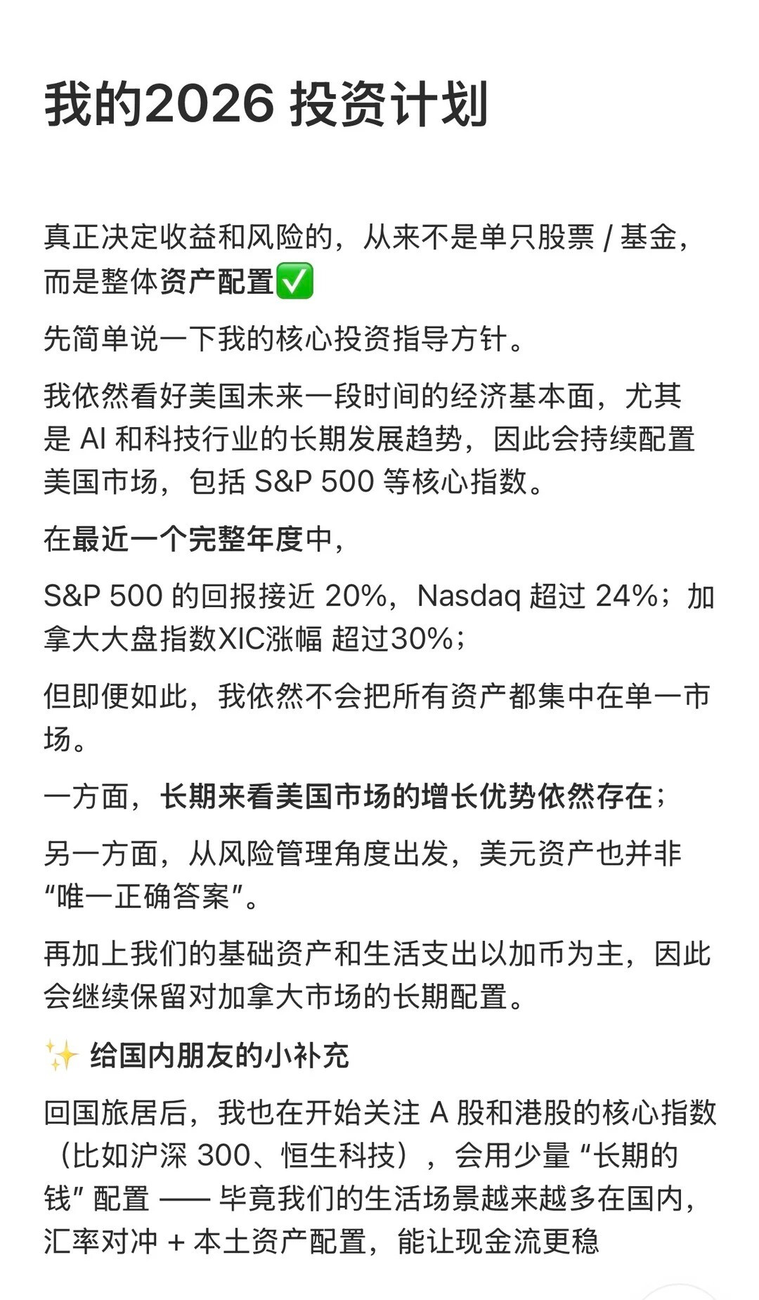 小红书网友@漫漫的旅途发帖说:提前退休回国-2026 投资计划。