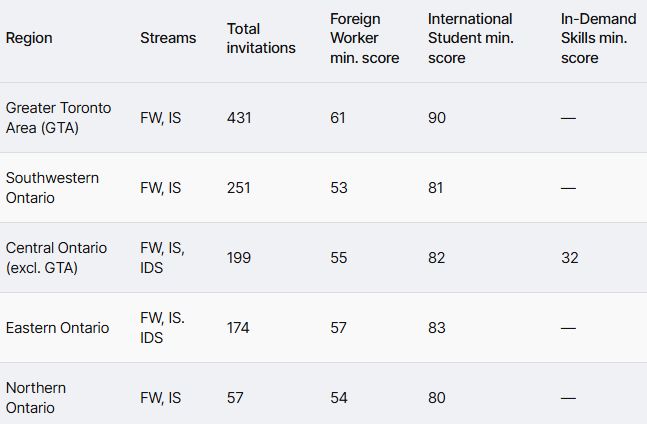 OINP本次在安省五个地区发出邀请:大多伦多地区(GTA)、安省西南部、安省中部(不含GTA)、安省东部以及安省北部。其中,大多伦多地区发出的邀请最多(431个),而安省北部最少(57个)。各地区的分数要求如下: