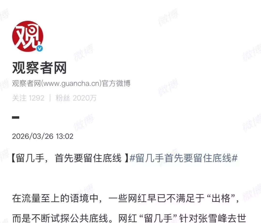 一是,底线,因为讽刺张雪峰的死亡,千万级别网红留几手被禁止关注。正能量媒体观察者网评论说,留几手,首先要留住底线。