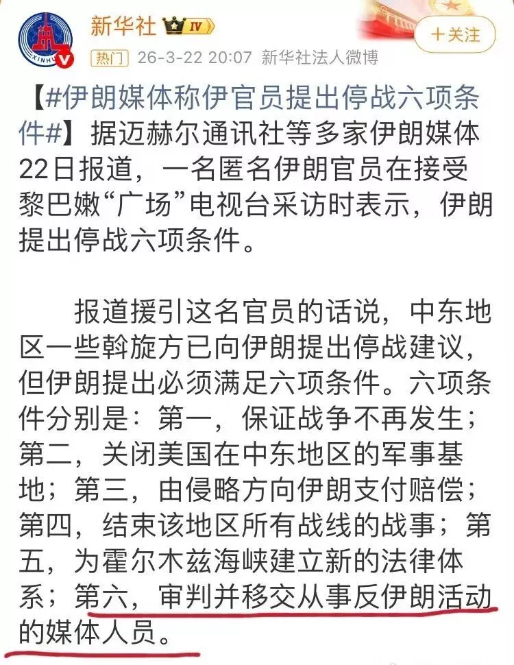 看新华社的报道才知道,伊朗开出的停战条件,原来包含审判反对伊朗的媒体。大家为了不被审判,或许只能报道伊朗的好消息,也只能支持伊朗了!(当然,我说的不一定对)