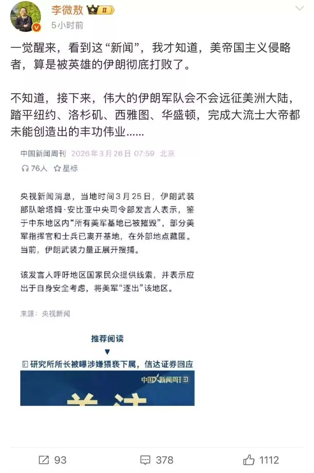三是,我在想的是,为何这些媒体都在宣传伊朗节节胜利的新闻,是因为朴素的“正义感”吗?
