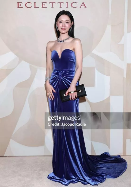 她身着宝蓝色丝绒长裙,搭配同色的宝石项链、钻石耳饰,太耀眼了。
