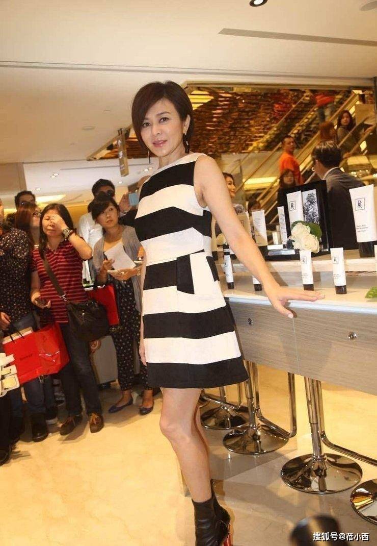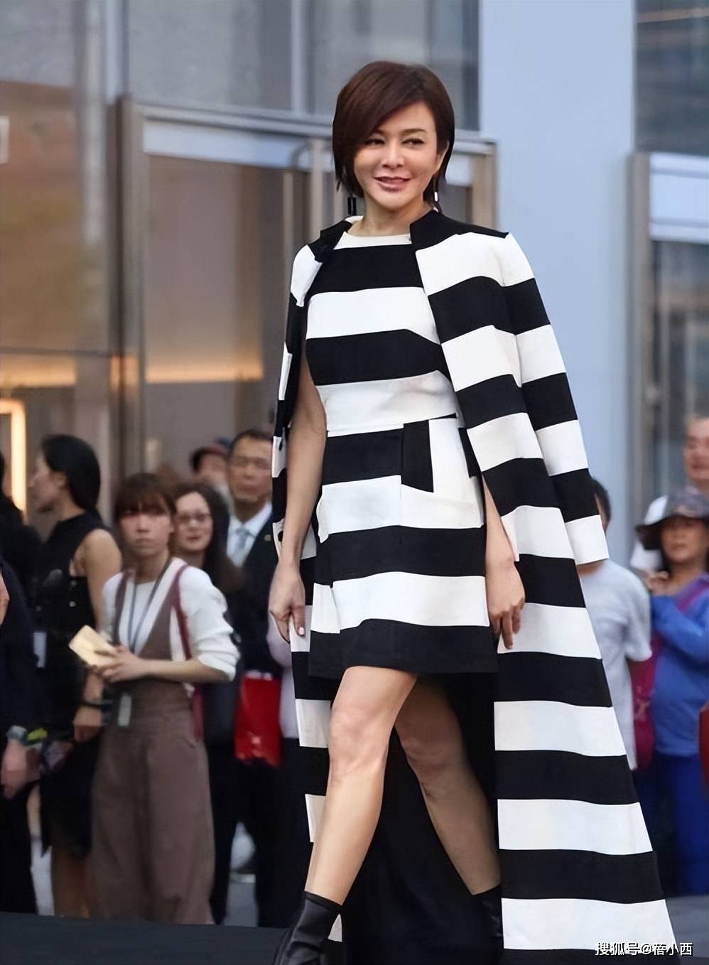 再看这一身搭配,关之琳选择了一套黑白条纹无袖短裙,将干练与性感巧妙平衡。经典的黑白横条纹视觉上显瘦又大气,无袖设计露出纤细手臂,剪裁合身,裙摆刚好卡在大腿中部,凸显了利落的腰线,又衬得双腿修长笔直,完美展现了她紧致的身材状态。