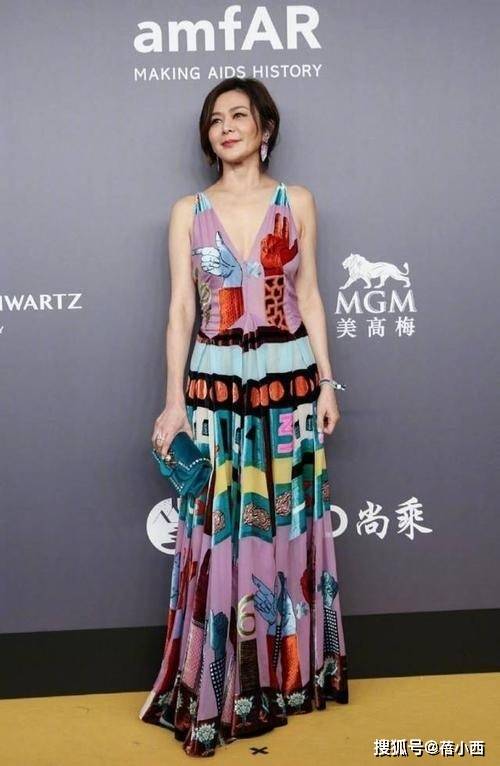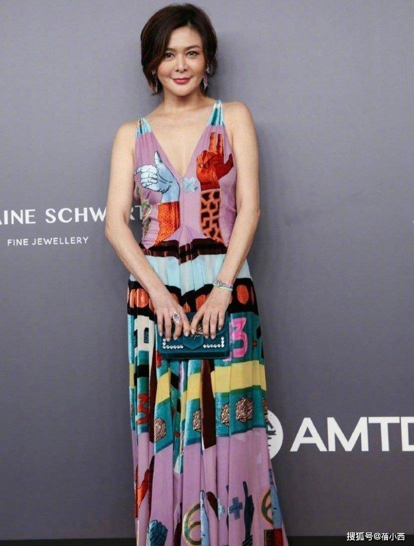 在某次红毯上,关之琳身穿一袭彩色涂鸦吊带长裙惊艳亮相,深V吊带设计大方露出肩颈线条,衬得她锁骨精致、体态轻盈,完全看不出岁月痕迹,裙身以淡紫色为基底,印满色彩斑斓的几何图案,红、蓝、黄、绿等亮色碰撞,既充满艺术感又不失活泼,瞬间打破了红毯造型的沉闷感。