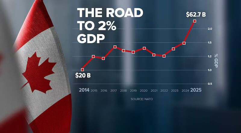 根据北约秘书长今晨发布的年度报告数据,加拿大在2025年的国防支出超过600亿加元,占国内生产总值的2%。