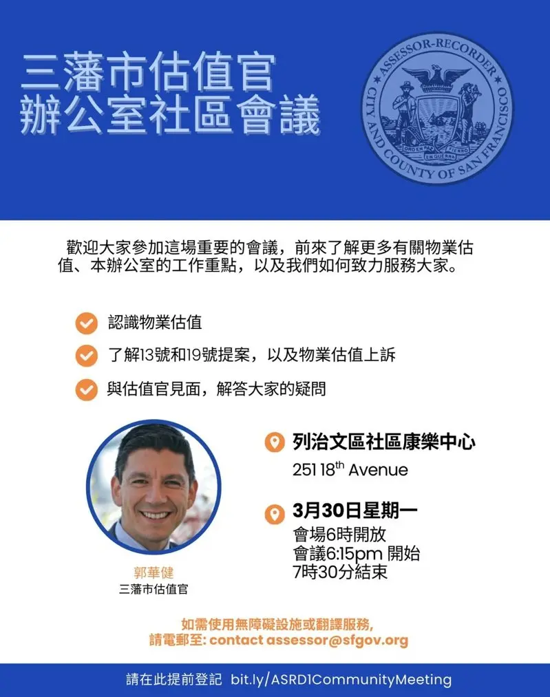 估值官办公室将举办「认识你的估值官」(Meet Your Assessor)社区说明会,向民众解说房产估值、Proposition 13与19相关政策,并提供现场问答机会,协助居民更了解自身权益。