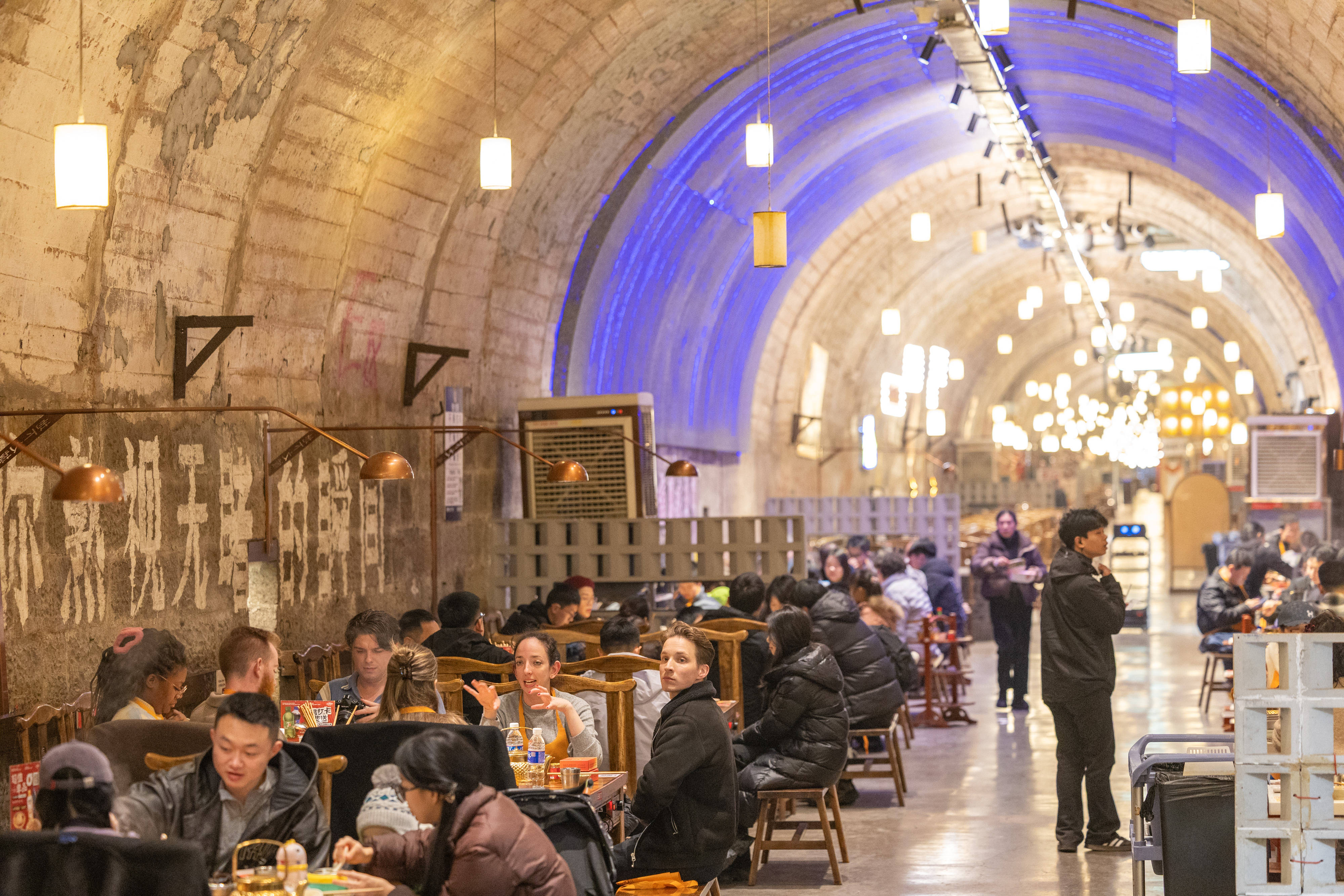 在重庆市两江新区,外国游客在防空洞内品尝重庆火锅。 新华社记者 黄 伟 摄
