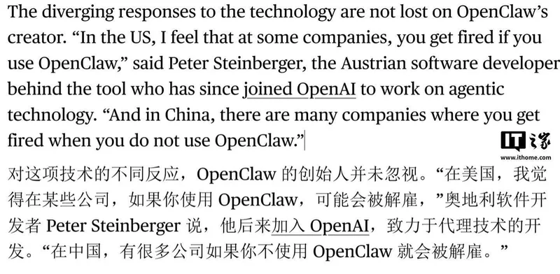 针对中美两国企业推行 AI 的差异,斯坦伯格用一句话概括为:“在美国,我认为至少存在某些公司,会因为你使用 OpenClaw 而裁掉你;而在中国,有很多公司会因为你不使用 OpenClaw 而裁掉你”。