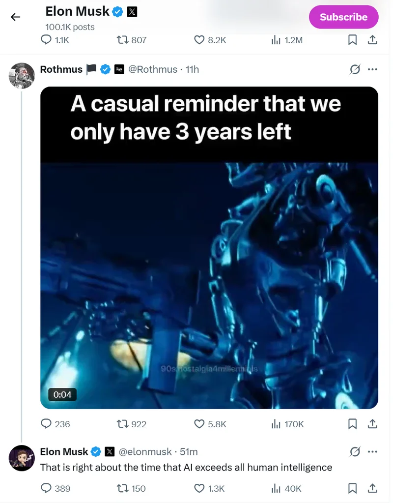3月27日,埃隆·马斯克在社交平台X上回复网友发布的视频时表示,人工智能将在3年后超过所有人类智能。