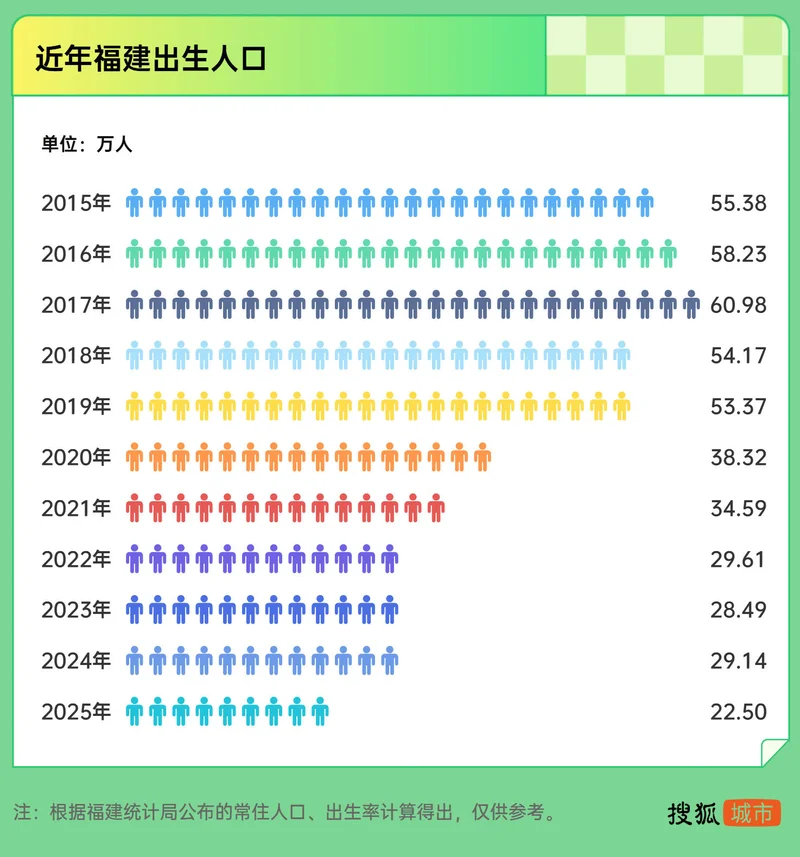 此后福建人口出生率持续走低,直至2025年低于全国均值。搜狐城市根据福建人口规模和出生率计算,去年福建出生人口约为22.5万,较2019年减少30.9万,6年缩水58%。