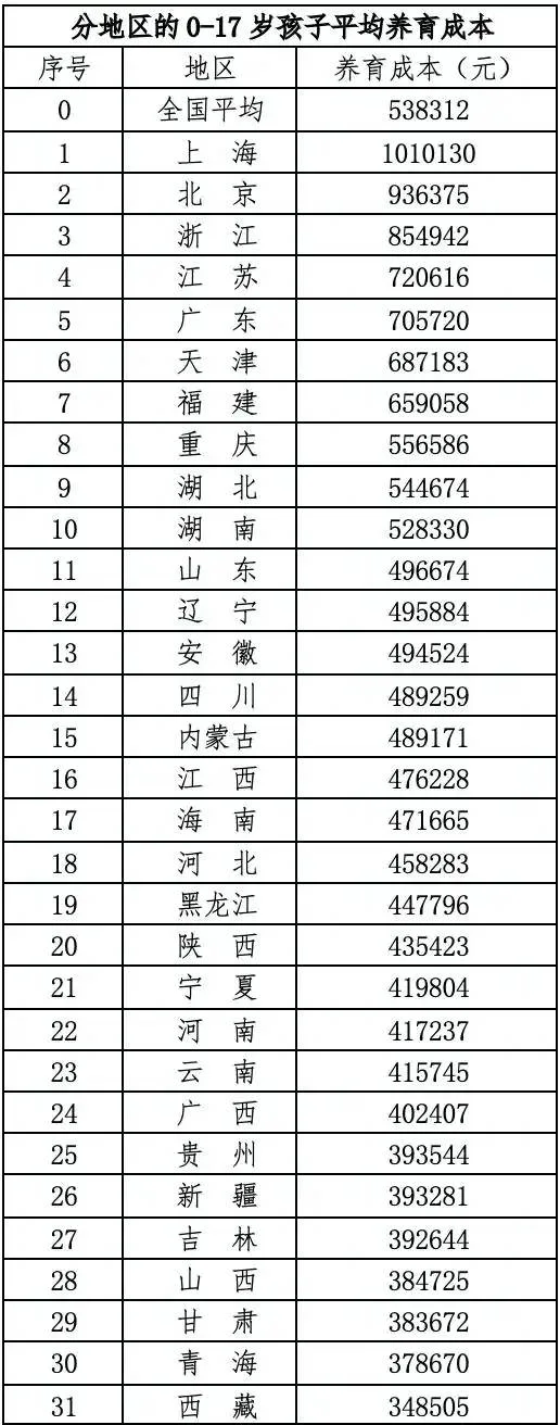 各大省份0-17岁孩子平均养育成本。图/《中国生育成本报告2024》