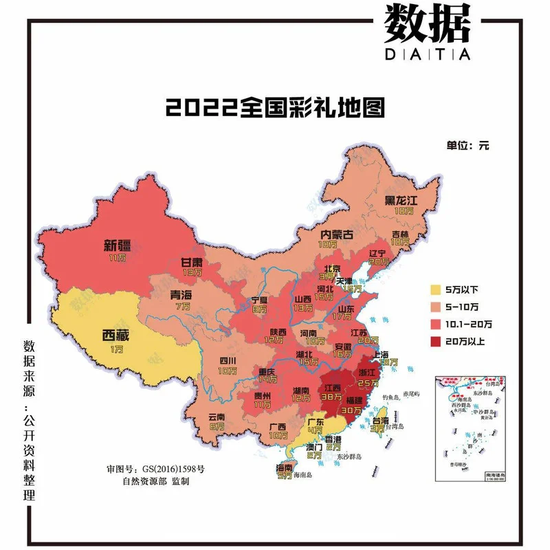 先看彩礼。2022年,有媒体根据公开资料整理了一份全国彩礼地图,江西以38万的价格居首,福建30万紧随其后。据当地网友所言,福建沿海地区、民营经济发达地区、侨乡聚集地区彩礼普遍更高,可达上百万。