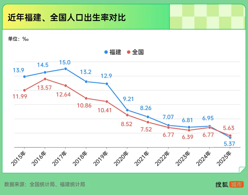 同期福建人口出生率从12.9‰下降到5.37‰,下降了7.53个千分点,2025年更是近十年来首次低于全国均值;出生人口从53.4万下降到22.5万,降幅达到58%。