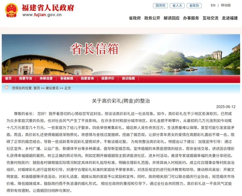今年5月,还有莆田村民给省长写信,谈论当地高价彩礼现象。信中提到,在许多农村和部分城市地区,彩礼金额不断攀升,从最初的几万元涨到如今动辄十几万元甚至几十万元,“一些家庭为了给儿子娶亲,四处举债筹集彩礼”。