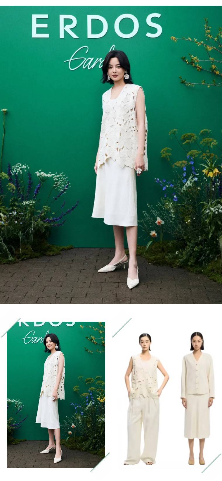 辛芷蕾身穿ERDOS米白色钩花无袖马甲+同色系直筒半裙,整套look温柔又透气,镂空树叶纹样自带春日氛围感,和背景的绿植墙完美呼应;珍珠花朵耳饰+戒指,细节里藏着精致,却不会显得刻意。