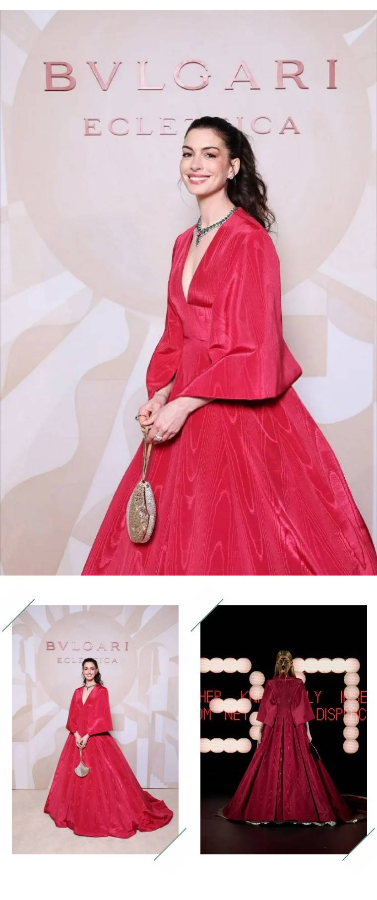 安妮·海瑟薇则身穿Valentino 特别定制红色深V长裙,挺括的材质犹如一朵盛开的红玫瑰,浪漫又明艳,佩戴BVLGARI ECLETTICA万象艺境高级珠宝,绿色宝石与红色裙装形成对比,巧妙点题。