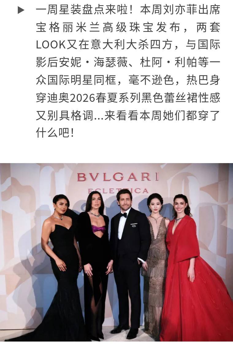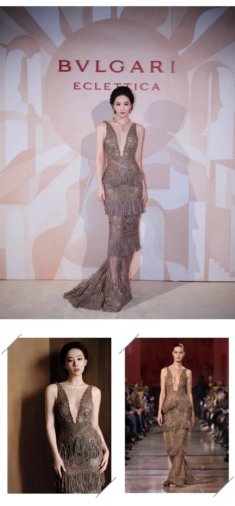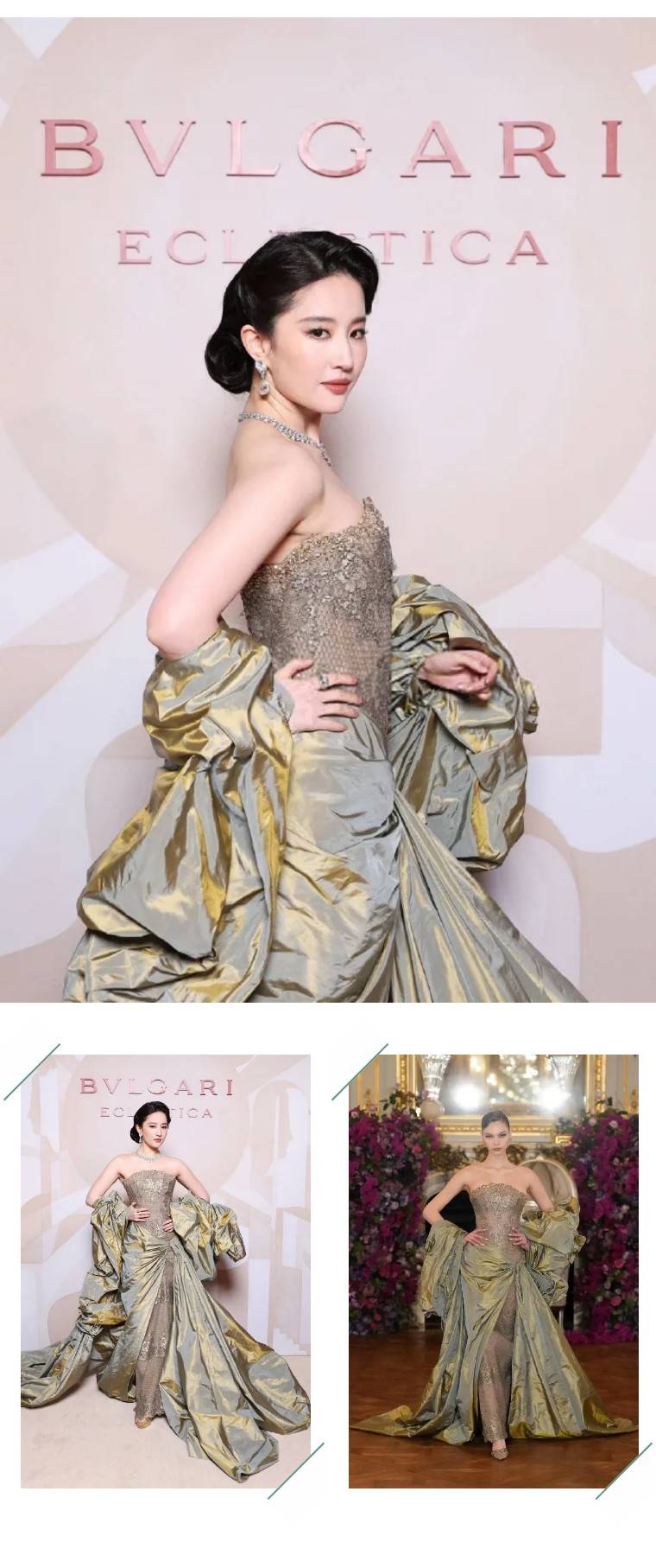 第二套造型身穿Miss Sohee 2026春夏高定亚洲首穿礼服,鎏金抹胸设计配复古盘发,佩戴全新BVLGARI ECLETTICA万象艺境高级珠宝系列作品,颈间项链凝练古典建筑的美学语言,一整个雍容奢华。