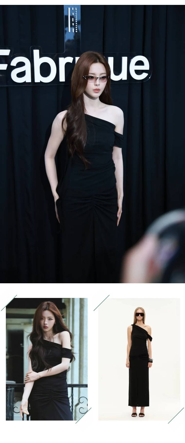 杨超越身着Fabrique X Vera Wang黑色斜肩抽褶裙,单边露肩+腰部褶皱设计,把身材曲线修饰得恰到好处,低调又显腰细;渐变窄框墨镜是灵魂单品,瞬间提升了“生人勿近”的御姐感,和黑裙的冷调完美融合。
