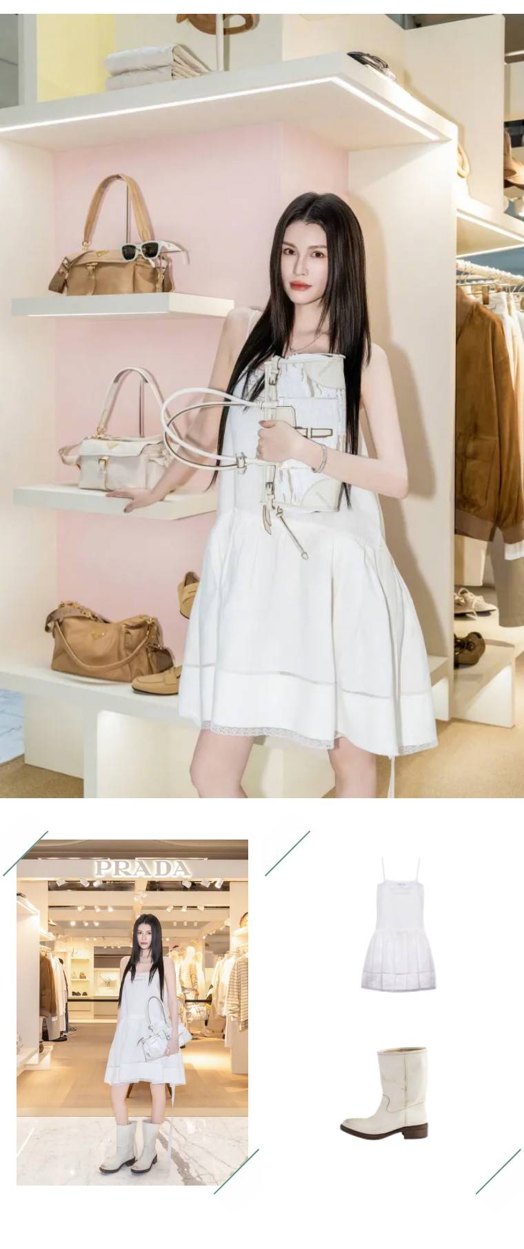 何穗出席PRADA北京SKP限时店活动,白色连衣裙搭配宽筒靴,甜酷结合,极简白+利落剪裁,把超模的身材优势完全释放,既有少女的轻盈感,又带着PRADA标志性的酷感,很适合春夏出街,清爽又吸睛。