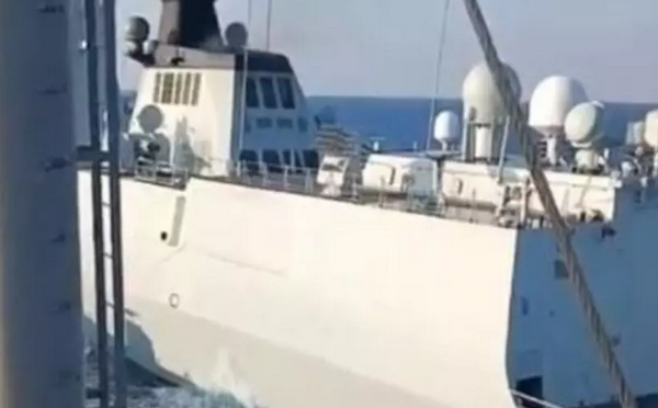 菲律宾武装部队西部军区发布的一段视频显示,3月25日,在中业岛附近的一次海上遭遇中,一艘解放军海军054A型导弹护卫舰执行机动动作,菲海军坦克登陆舰“本格特”号成功避免了潜在的碰撞。 © 网络图片