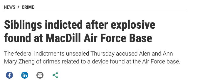本月,佛罗里达州坦帕(Tampa)的麦克迪尔空军基地(MacDill Air Force Base)一处入口外发现一枚爆炸装置,一名已逃至中国的男子及其姐姐因此被起诉。一名联邦检察官周四表示,两人的母亲因签证逾期被拘留,正面临遣返。