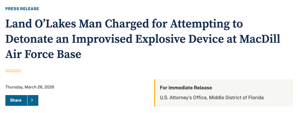 解封的起诉书显示,郑艾伦被控企图破坏政府财产,以及制造并持有简易爆炸装置。检方指控其将该装置安置在麦克迪尔基地访客中心附近。