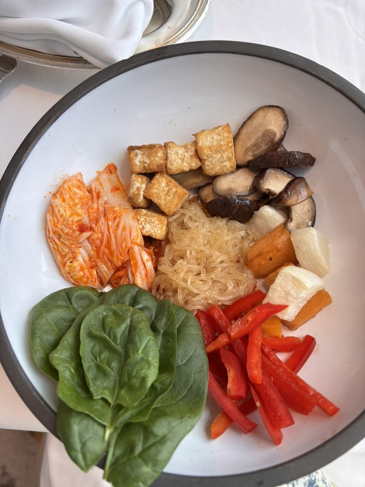 双人午餐:1生牛肉,2猪肝泥,3蘑菇汤,4韩式沙拉,5虾,6三文鱼,7甜食
