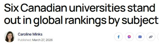 2026年共有6所加拿大大学进入不同学科的全球前100名,与去年持平。
