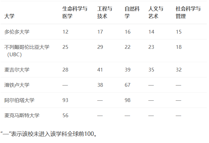 多伦多大学(University of Toronto)和不列颠哥伦比亚大学(UBC)在五大类学科中均进入全球前30。