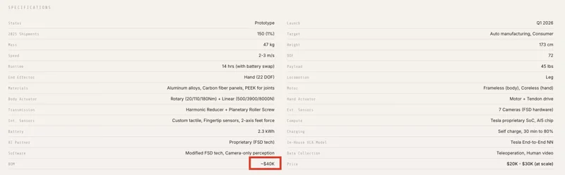 哪怕是拥有极致垂直整合能力的特斯拉 Optimus,目前的 BOM 成本也徘徊在 4 万美元左右,马斯克那句“将售价打到 2 万美元以下”的承诺,依然是一个需要时间去兑现的远期目标。