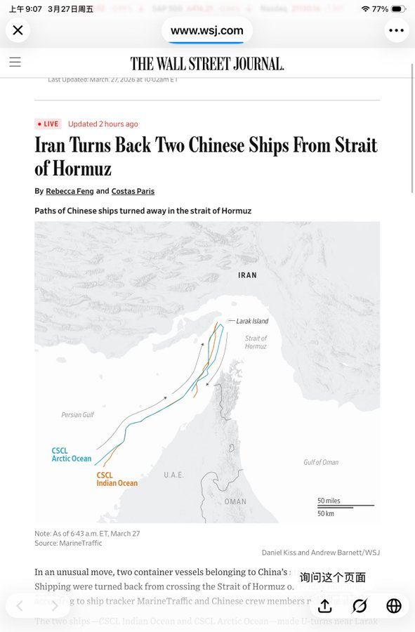 多家媒体爆料,周五(3月27日)上午发生一起不同寻常事件,两艘隶属于中共国有企业中远海运(Cosco Shipping)的大型集装箱船在试图穿越霍尔木兹海峡时突然掉头折返。