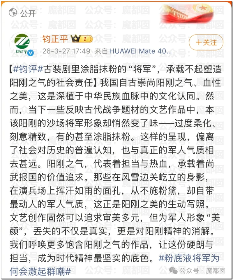 说下标题上的事情。我们首先想问一句,大家知道“钧正平”是谁吗?这事情真的闹大了……一般“钧正平”这个账号很少参与娱乐圈的事情,我们记忆里还是第一次看到如此正面直接的怒批一个古偶剧……我们没有危言耸听,请大家仔仔细细看一下这个“钧正平”到底是谁:
