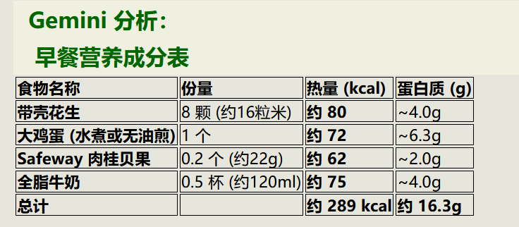 蛋白质质量提升: 相比之前的早餐(~10g 蛋白),今天加入了一个完整的鸡蛋,让蛋白质总量提升到了 16.3g。鸡蛋提供了全价蛋白和胆碱,对大脑清醒很有帮助。