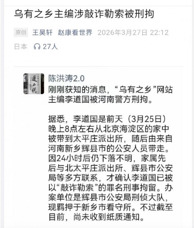 2026年3月25日,网传毛左网站 “乌有之乡”主编李道国在北京被河南警方跨省抓捕,涉嫌罪名是“敲诈勒索罪”。(网络截图)