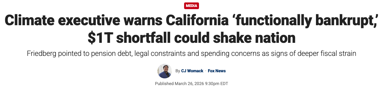 据3月26日报道,气候科技企业家David Friedberg近日在节目《Sourcery》中表示,加州在财政层面已处于“功能性破产”(functionally bankrupt)状态,并指出养老金负担、法律约束以及政府支出是可能引发长期财政危机的主要因素。