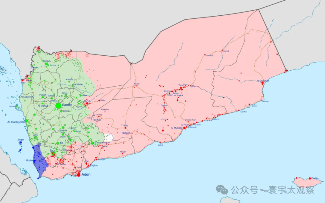 需要说一句,国际社会并不认为胡塞可以代表也门共和国。联合国所承认的也门政府,驻地位于亚丁。下图中的绿色部分为胡塞占据的地盘(包括萨那),粉红色部分为国际所公认的也门政府地盘。