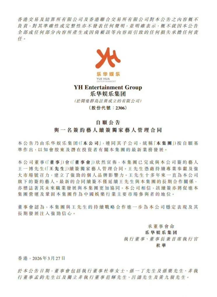 对乐华而言,续约王一博就稳住了“半壁江山”。乐华业务高度依赖艺人管理,王一博是核心支柱,若失去他,营收会大幅收缩、股价承压,而目前公司暂无能替代他的顶流,练习生孵化也需时间。