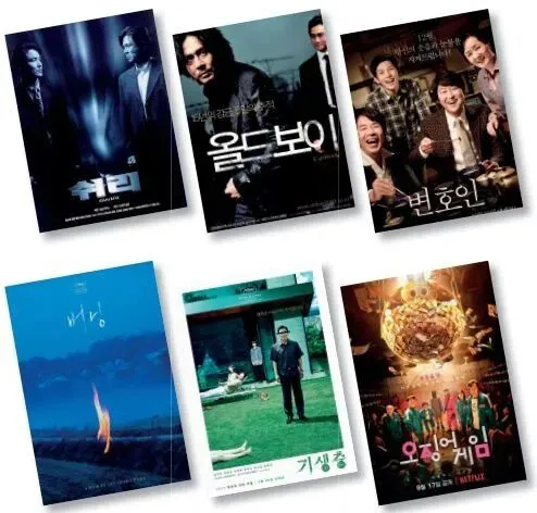 (下排左起)《燃烧》(李沧东导演,2018年),《寄生虫》(奉俊昊导演,2019年),《鱿鱼游戏(第一季)》(黄东赫导演,2021年)