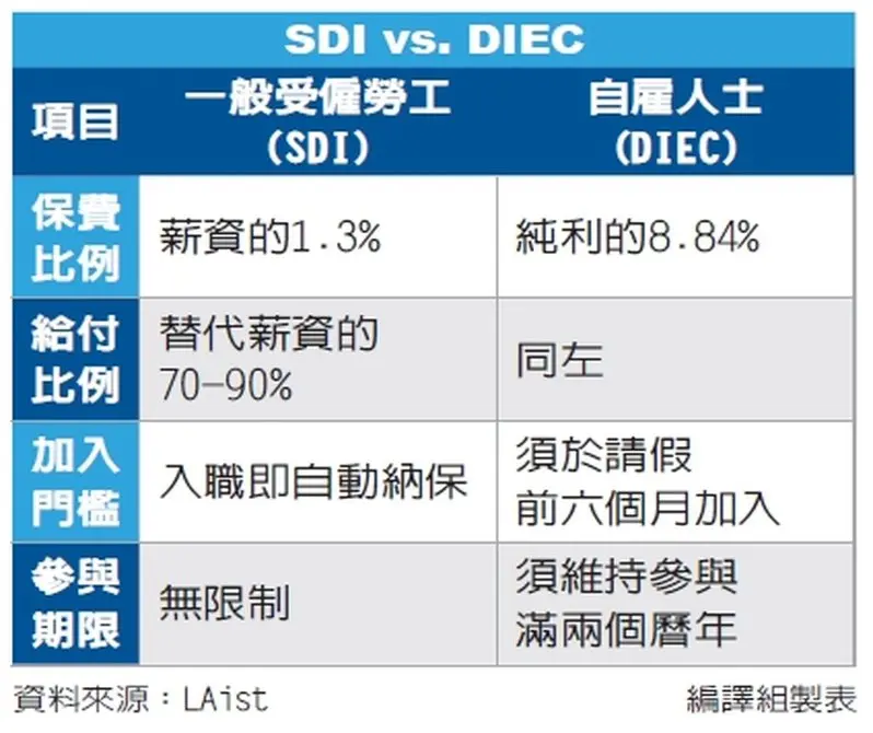 不同于私部门劳工会自动从薪资单扣除款项参与「州立伤残保险」(State Disability Insurance,下称SDI),自雇人士必须主动加入一项名为「伤残保险自选保障计画」(Disability Insurance Elective Coverage,下称DIEC)的独立方案,才能享有相关福利。