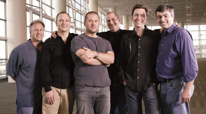 iPhone诞生内幕曝光,从手指触控平版电脑开始。 图为iPhone team-席勒、费德尔、艾夫、乔布斯、佛斯托尔与库依合影。 (图/天下文化提供)