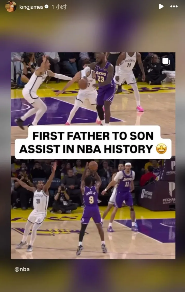 赛后,詹姆斯也更新个人社交媒体转发了这一瞬间并写道:“NBA历史首个父亲为儿子送出的助攻。”