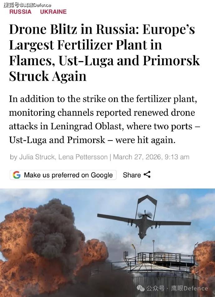 而就在前一天,也就是3月27日,8架乌克兰无人机还击中了位于沃洛格达州切列波维茨市的"阿帕提特"股份公司工厂,该公司是欧洲最大的含磷肥料、磷酸和硫酸生产商,也是俄罗斯NPK复合肥生产规模最大的企业之一,其产品不仅包括各种化肥,也包括炸药。
