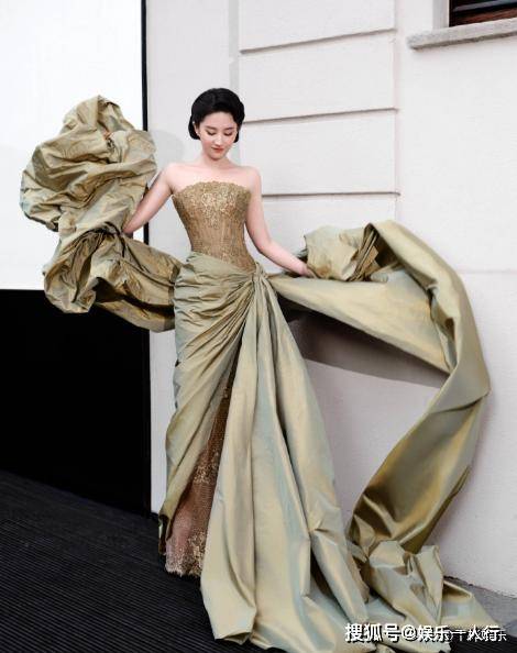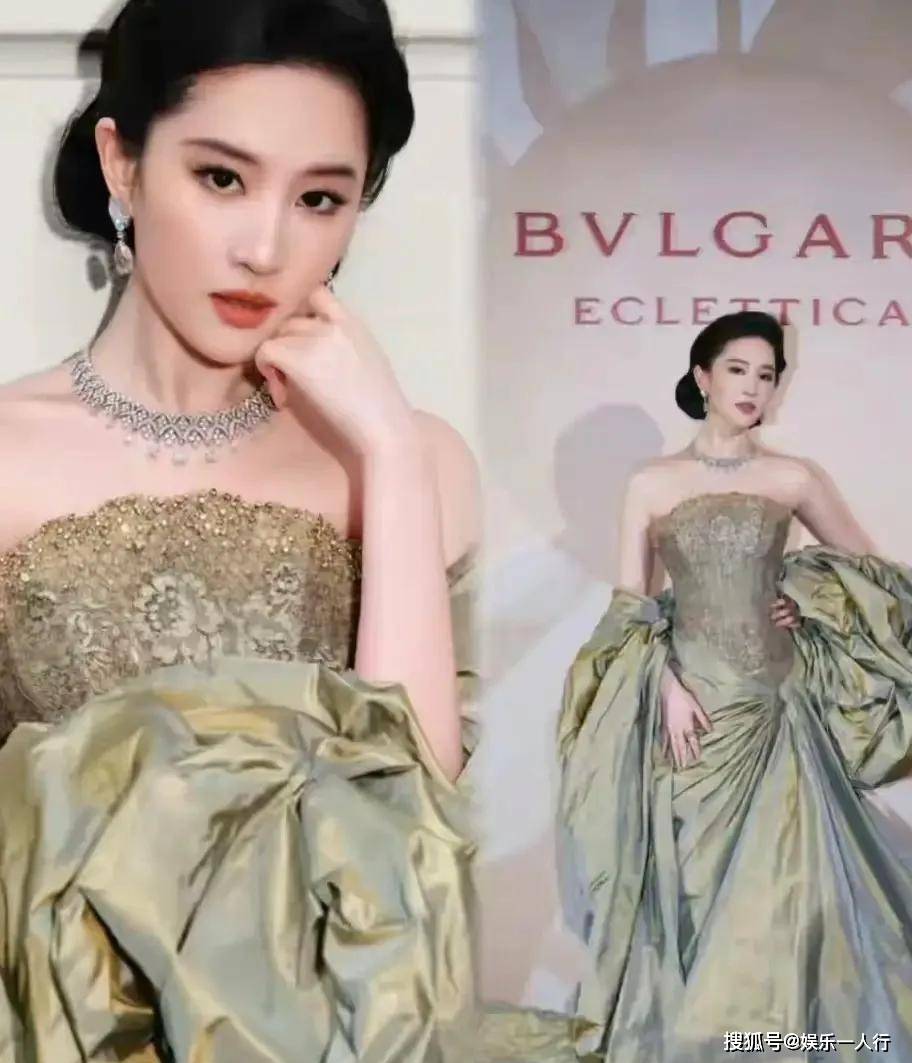 如果说第一套是“仙”,那第二套Miss Sohee的金色宫廷风长裙就是“贵”。暖金色的重工面料,复古的露背设计,搭配宝格丽灵蛇系列的钻石珠宝。这种极致西化的华丽廓形,很容易把人穿得像个移动的圣诞树,但刘亦菲用她东方的骨相和清冷疏离的气质,完美地消化了它。冷白皮与暖金色碰撞,东方美人的温婉含蓄与巴洛克式的奢华融合,产生了奇妙的化学反应。她不是在扮演欧洲贵族,而是用东方的气韵,给这种古典美学注入了新的灵魂,真正做到了“人衣合一”。外媒用“行走的文艺复兴画中人”来形容她,再贴切不过。