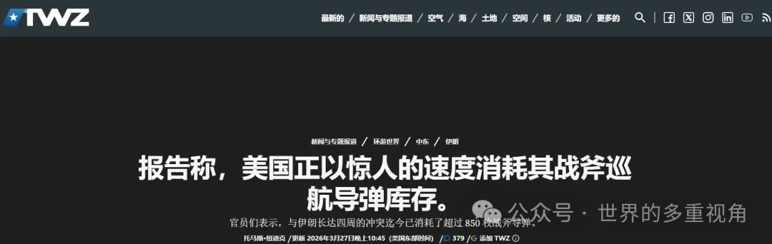 根据《The War Zone》、《华盛顿邮报》的消息,从2月28日开战至今,美国已经发射了850枚“战斧”巡航导弹,至少占据战前总库存的的21%(按照外界的推测,美军的“战斧”库存在3000枚~4000枚)。