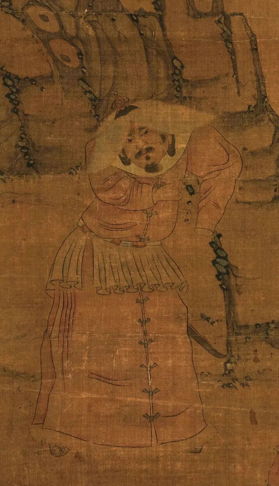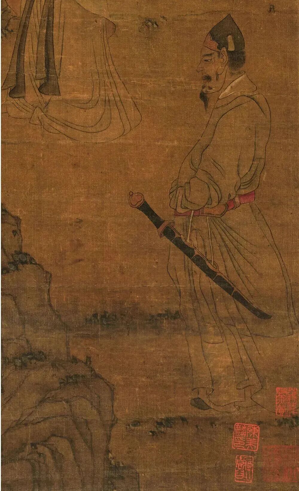 陈洪绶的线条也怪得很。人物轮廓扁扁的,像被岁月压扁了;衣纹像刀刻的版画,硬邦邦的,可仔细看又藏着节奏——该紧的地方绷得像弓弦,该松的地方又飘得像云。这“怪”,其实是他在“以古为新”,把宋人的严谨、元人的放逸揉在一起,再掺进自己对乱世的感慨。