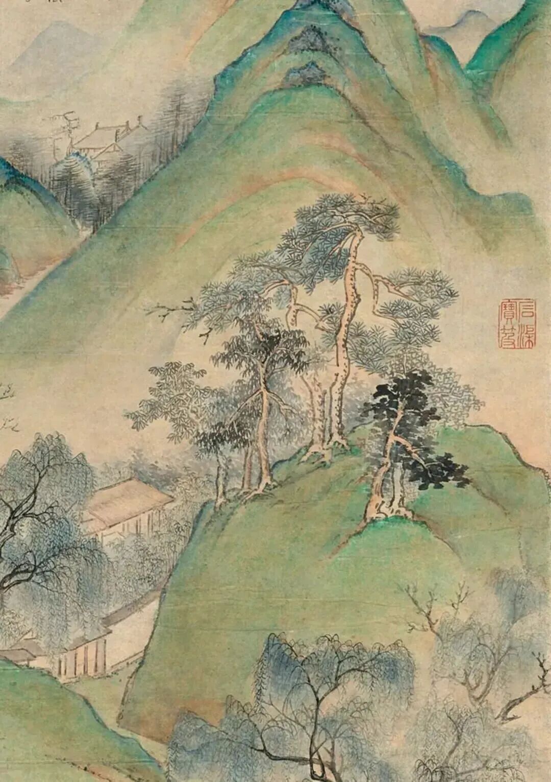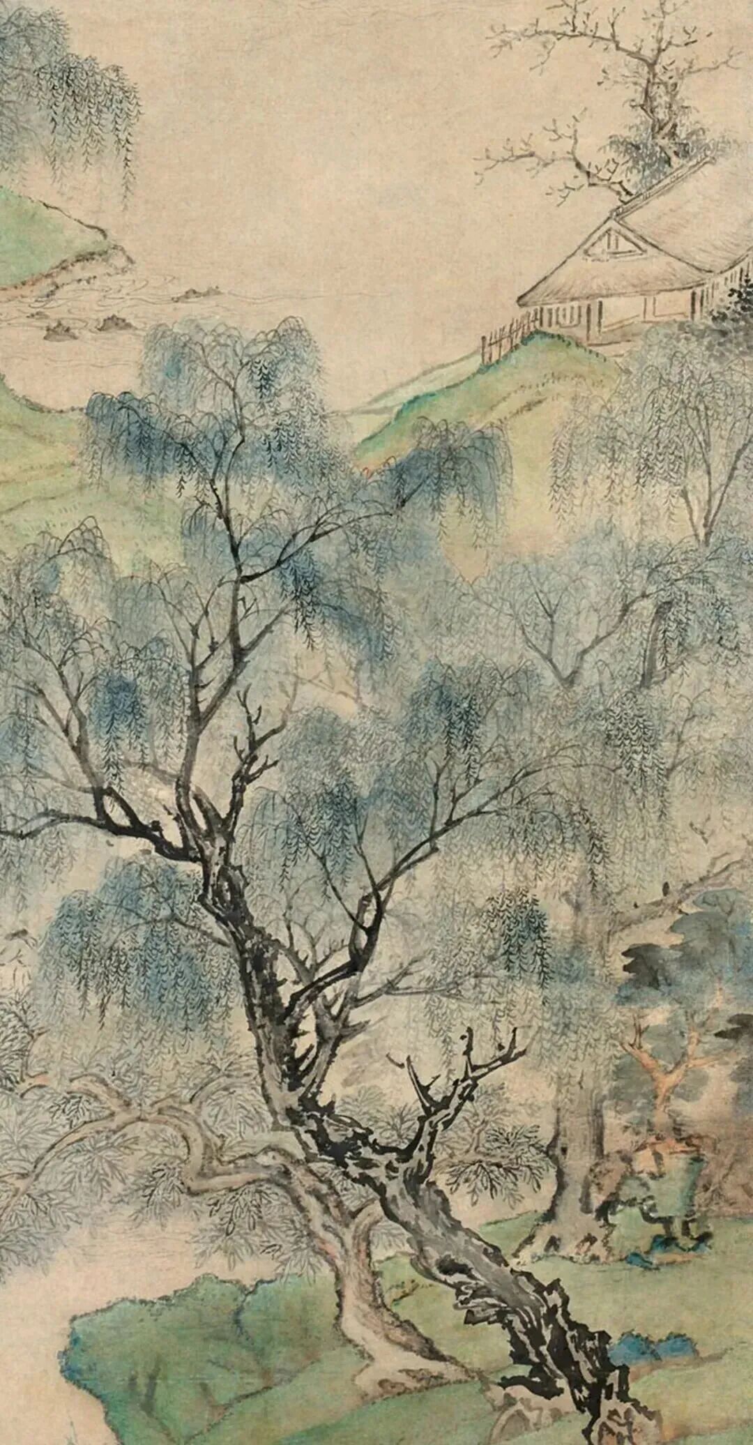 画里嫩绿的柳树,跟刚洗过头的小姑娘似的,清新又可爱。清澈的溪流,哗啦啦地流,仿佛能听见水声。农民伯伯在田间忙活着,这画面,不就是咱们向往的田园生活嘛!